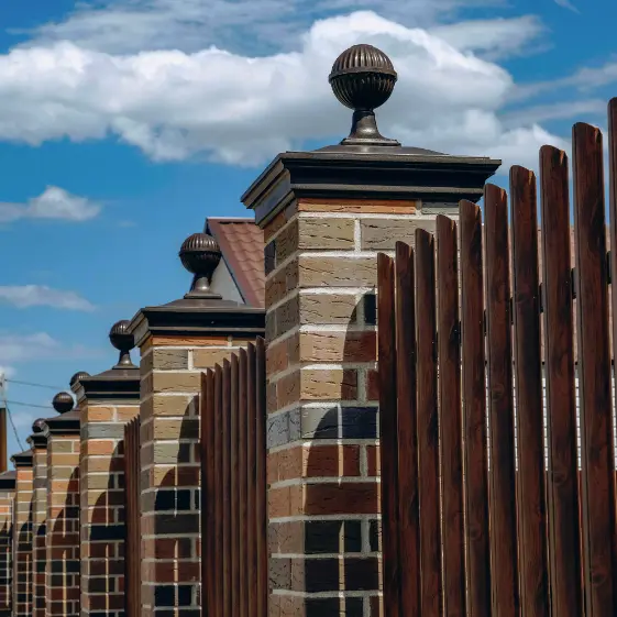 Эстетичный и долговечный вариант оформления ограждения: полимерпесчаный колпак коллекции Monblan с установленным подфонарником и декоративным шаром коричневого цвета. Колпаки гармонично расположены на кирпичных столбах забора, выполненного из штакетника Фигурного с фактурой под дерево в цвете Тёмный Дуб. Благодаря современному 3D‑покрытию Принтек, материал выглядит максимально натурально, подчеркивая стиль конструкции и добавляя ограждению солидности и выразительности.